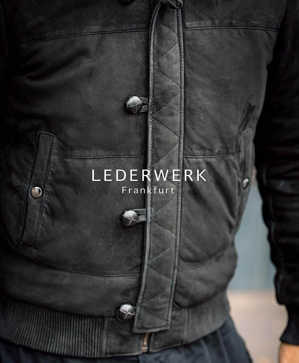 Der robuste Reißverschluss wird klassisch von einer Knopfleiste mit edlen Lederknöpfen verdeckt – ein stilvolles Detail, das Design und Funktionalität elegant verbindet. Die Lederbündchen an den Ärmeln sorgen für optimalen Sitz und verleihen der Jacke eine sportlich-zeitlose Silhouette.